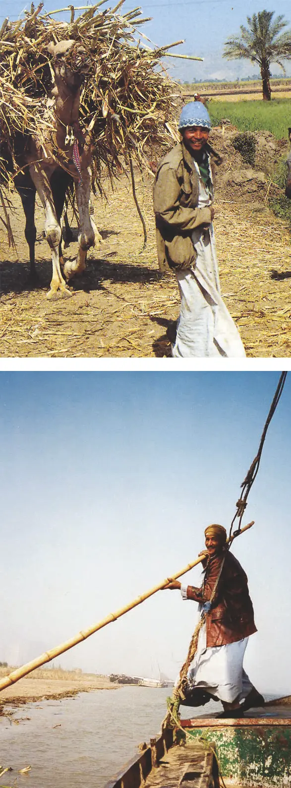 En ese límite, en las laderas de las montañas de arena y roca desgastada que bordean el valle, es donde vive la población dedicada a la agricultura. Así no malgastan en la construcción de sus viviendas ni un centímetro de la escasa tierra fértil. El paisaje amarillo, árido, contrasta con el azul intenso del Nilo y con los verdes: palmas de dátiles –frutos muy apreciados en el desierto–, enormes extensiones de algodón, lino, arroz, maíz, caña de azúcar, trigo, cebada, frutas, verduras. Además, crían ganado: búfalos, ovejas, cabras. Han logrado un rendimiento de más de nueve toneladas de arroz por hectárea. Es el elemento básico para su alimentación. Cada egipcio consume 120 libras al año.