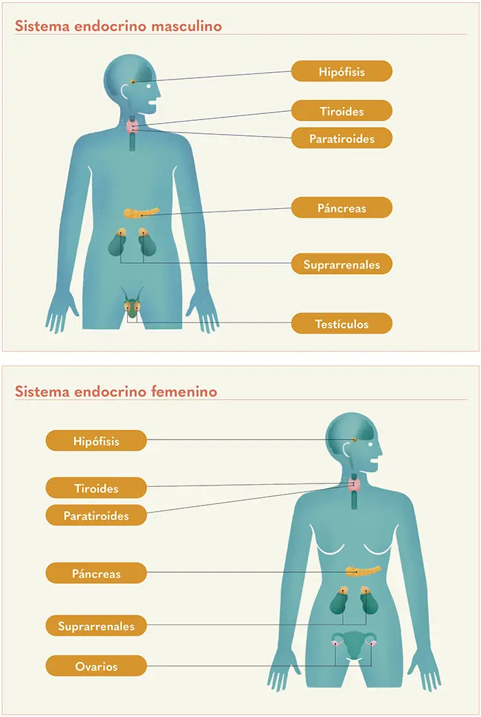 El sistema endocrino está formado por el conjunto de glándulas que producen hormonas, que son sustancias que llevan mensajes e información de una célula a otra.