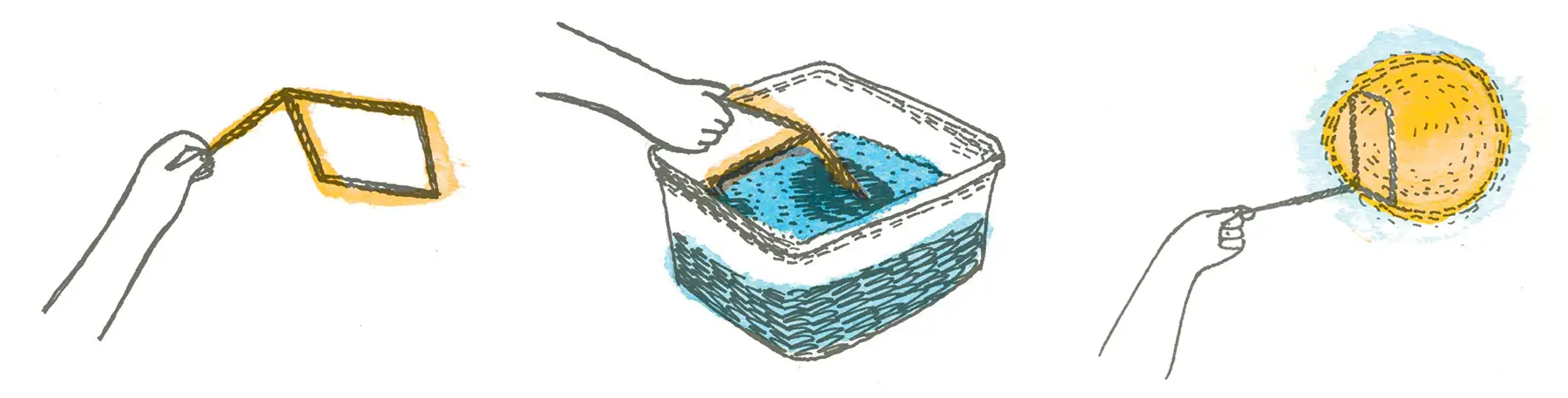 3. Saca primero el aro de la mezcla e intenta, con un movimiento suave en el aire, que salga una pompa. Haz lo mismo con el cuadrado. ¿Te sale una pompa cuadrada?