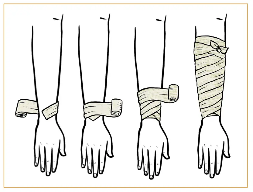 1. Siempre empezamos con dos vueltas circulares en la parte más distal (lejana) del cuerpo, sosteniendo la punta de la primera vuelta con la segunda vuelta (como aparece en la imagen del vendaje circular).